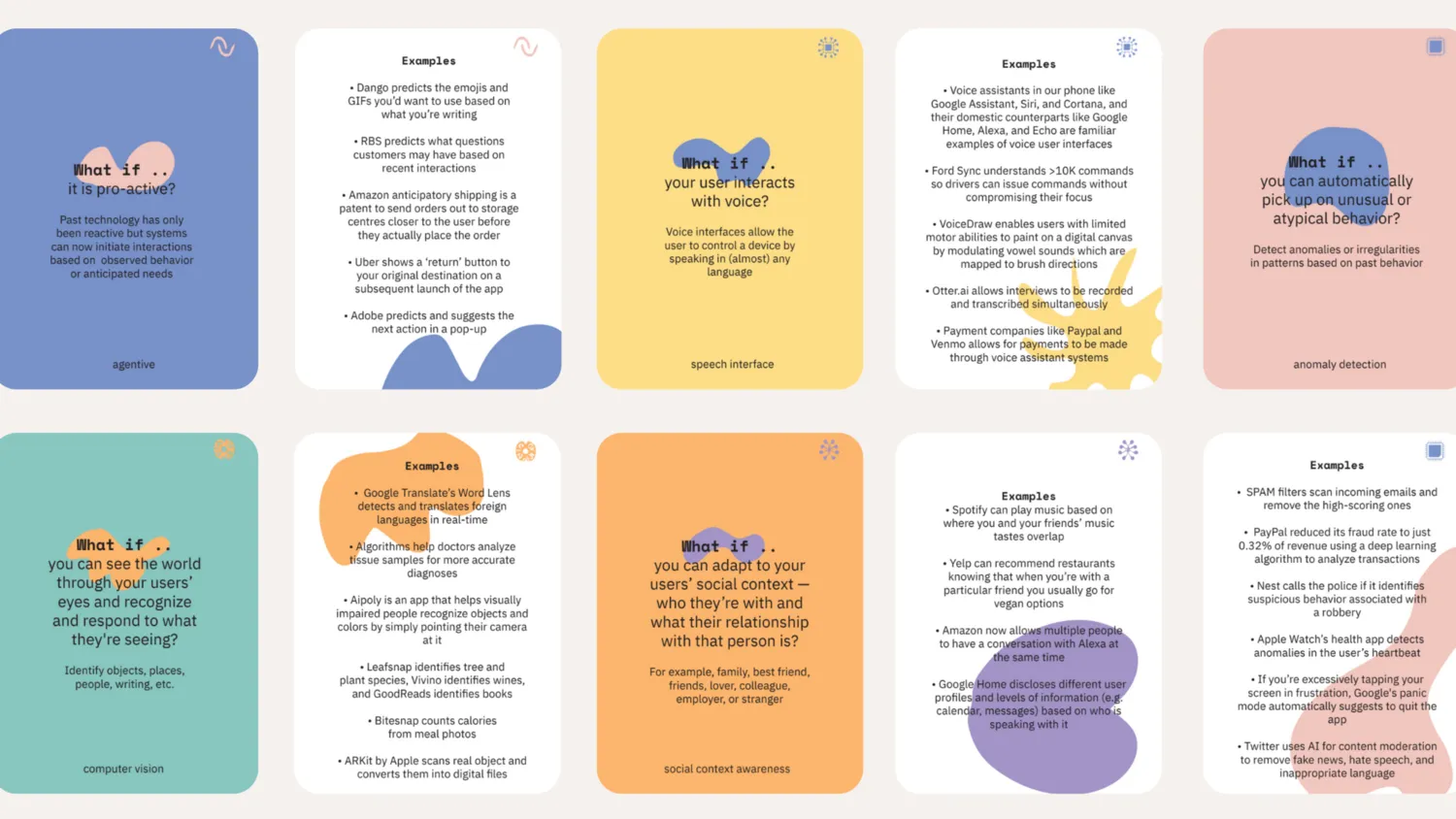 Have you ever questioned what AI can do for you, your team, your organization? How AI can help and support your processes? These cards got you covered! This deck will help you (and your team and/or clients) find answers and uncover opportunities for AI in your context and industry. The AI Ideation Card Deck helps designers, managers and innovators leverage AI capabilities available to us today for social, user & business value. It includes 24 colorful prompt cards with 100+ example use cases across 7 categories to use during brainstorm or ideation sessions. The digital edition includes a PDF downloadable of the deck, a link to access it at anytime online, and a Miro board you can duplicate to facilitate your own ideation session using the cards. If you're a non-profit, student, or in other way limited in your financial means, feel free to use the code N0NPROFIT for 15% off on check-out.